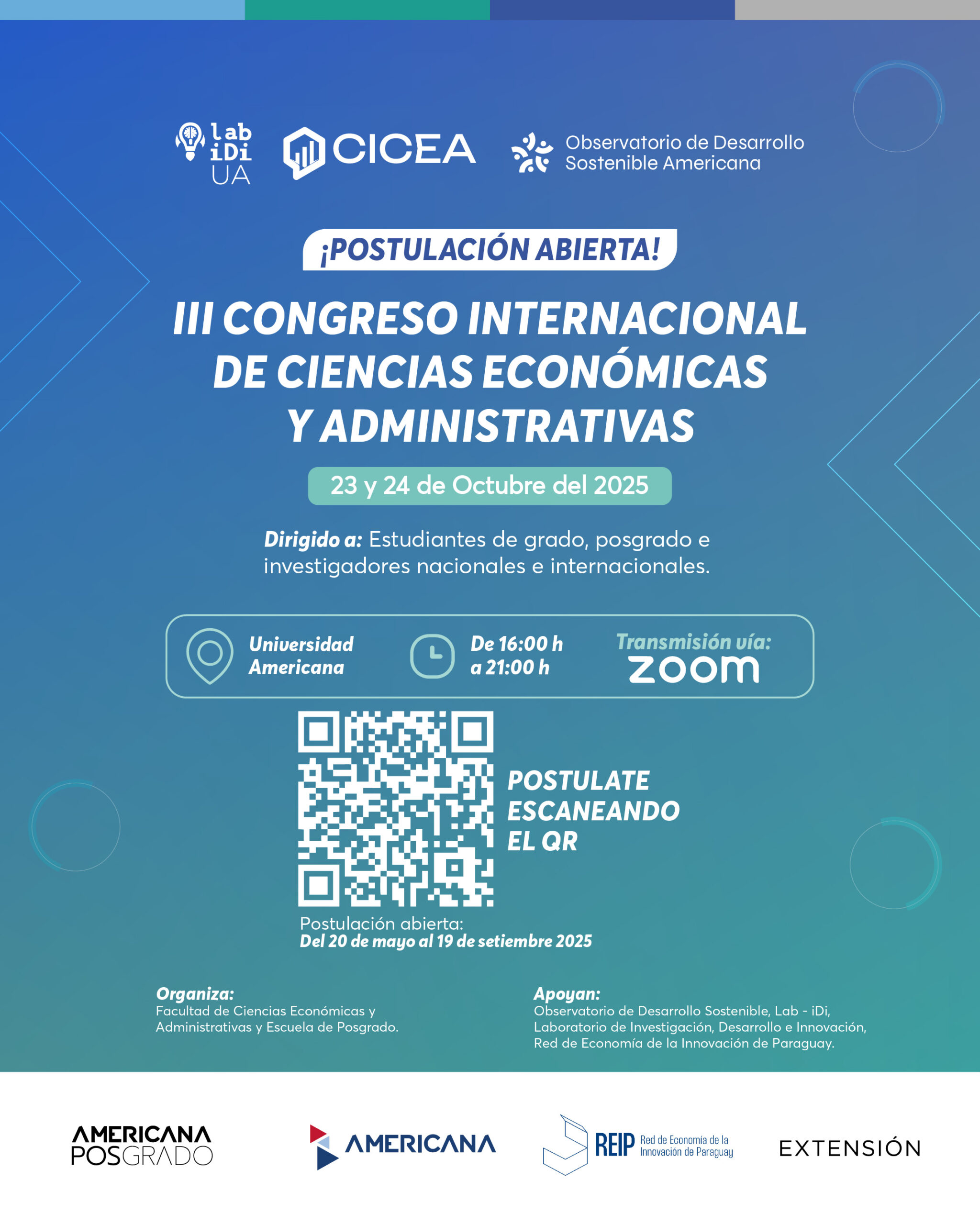 Bienvenidos al Congreso Internacional en Ciencias Económicas y Administrativas “CICEA” organizado por la Facultad de Ciencias Económicas y Administrativas y la Escuela de Postgrado de la Universidad Americana en la modalidad Presencial y ONLINE con el objetivo de Fortalecer la cultura investigativa a nivel Institucional y apoyar los procesos de la Investigación Científica/Académica
